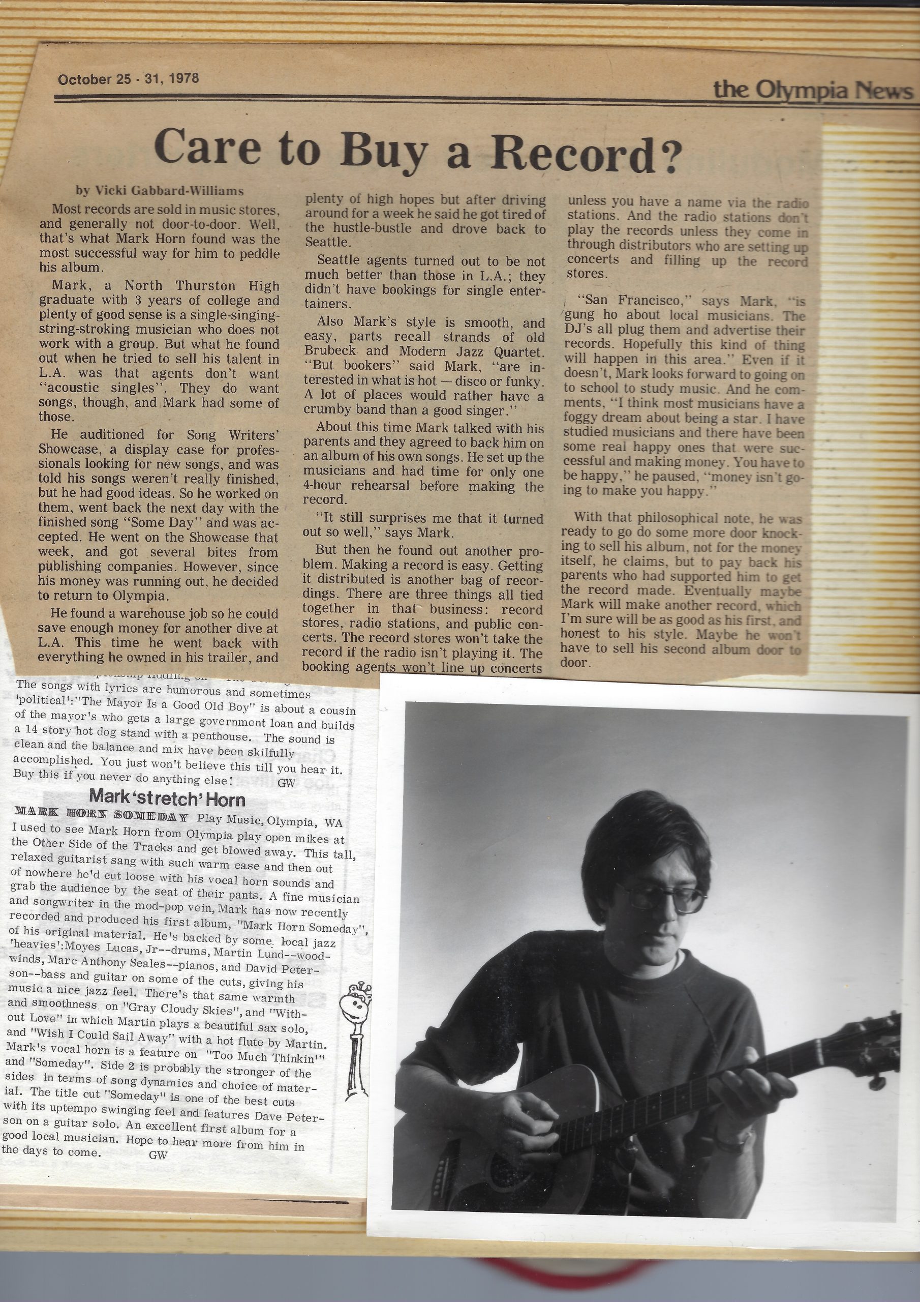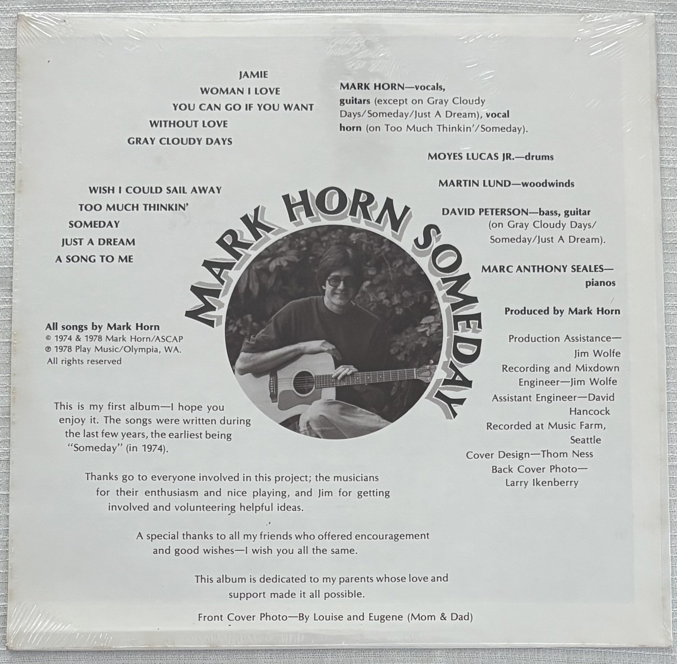 So, after one rehearsal, Mark borrowed $8,000 from his parents, and the recording started in the fall of that year, at Music Farm Studio in Seattle.  The result was a somewhat eclectic mix of soft rock and folk, with jazz influences – called MARK HORN SOMEDAY.  At this time in history, vinyl and cassettes were the only options.  So, Mark had 2,500 vinyl albums pressed and then began taking orders from friends and relatives, who would eventually account for about 300 sales.